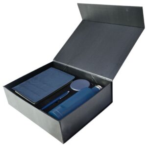 Gift set: notebook, bottle, earbuds, pen.