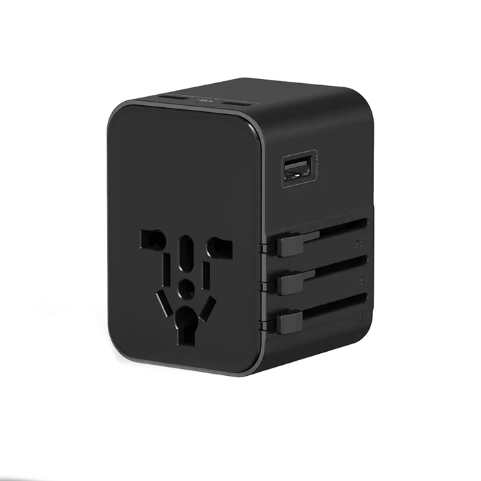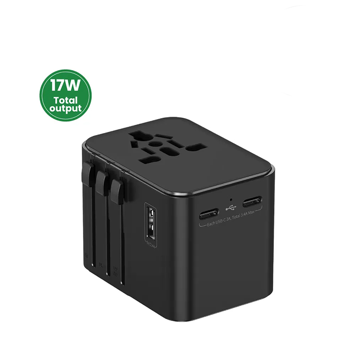 Versatile global travel adapter is crafted from durable ABC plastic and delivers a total 17W output with a powerful 2500W max capacity. It features dual USB and a Type-C port for fast charging across US, UK, AUS, and EU plug types. The universal socket and built-in 10A overload fuse enhance safety, with a spare fuse included. Finished in sleek black matte, it comes neatly packaged in a black zipper pouch and printed carton box.