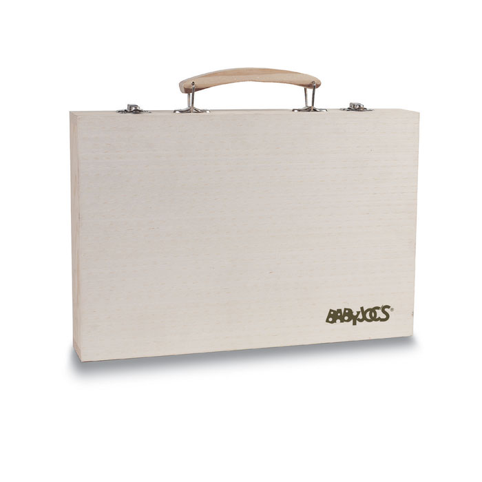 Artist’s set in wooden box including 66 pieces (wax crayons, oil pastels, markers, coloured pencils, water colours, sharpener, glue, eraser, paint brush, ruler, and pencil).