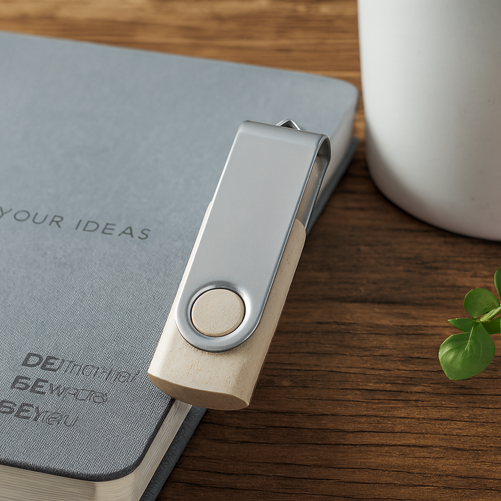 16GB USB Flash Drive with protective metal cover and wheat straw and PP casing. Rotate the cover and connect to USB port to start using it.