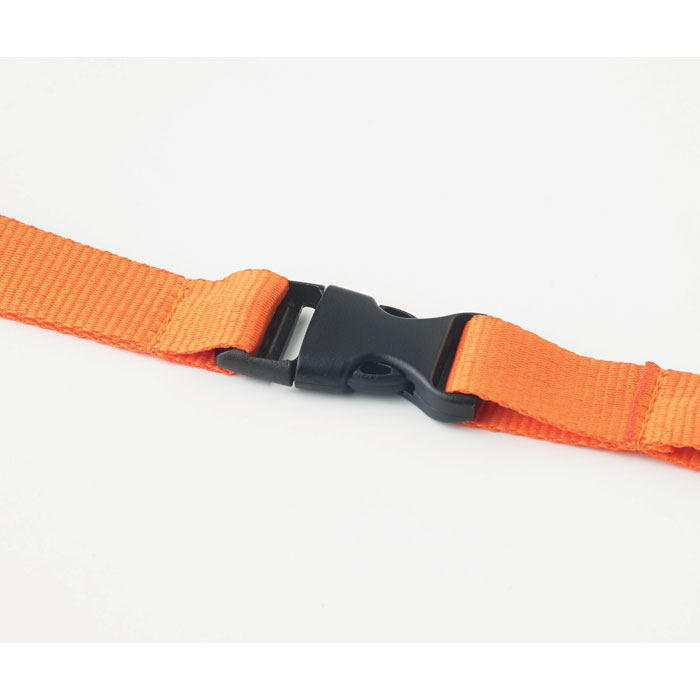 Lanyard with metal hook, detachable buckle and safety breakaway. 20 mm wide.