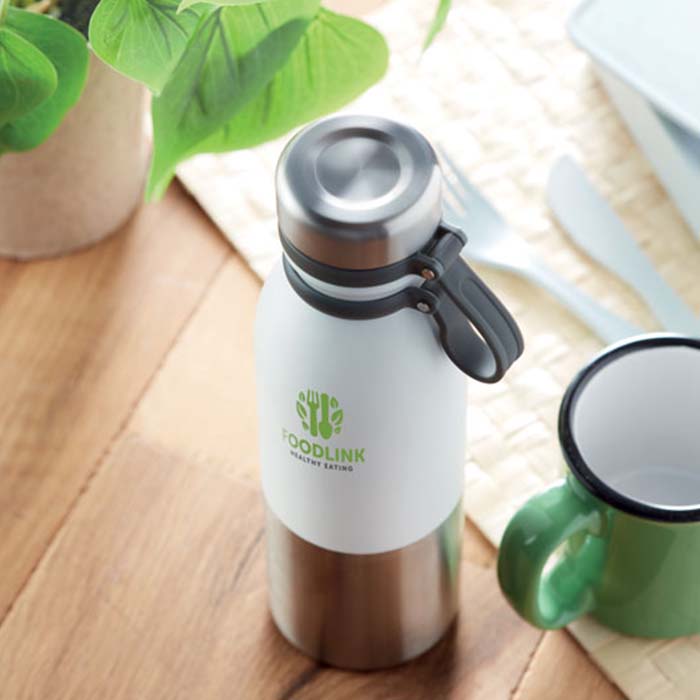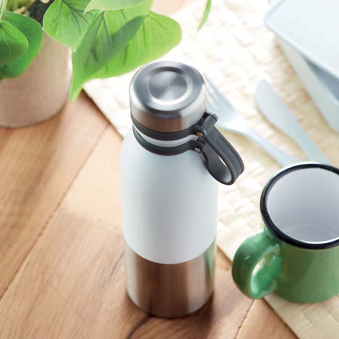 Double wall stainless steel powder coated flask with silicone grip for easy carry. Leak free. Capacity: 600 ml. Leak free.