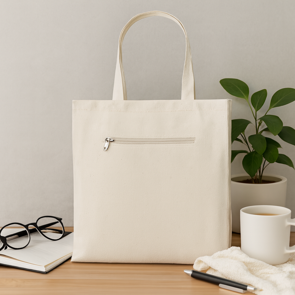 Canvas shopping bag with short handles and front zipped pocket. 280 gr/m².