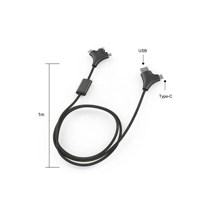 3-in-one long multi device charging cable. Made out of fabric and ABS. Prominent area for branding. Connects with type C devices, android and iPhones. Packed in recyclable kraft boxes.
