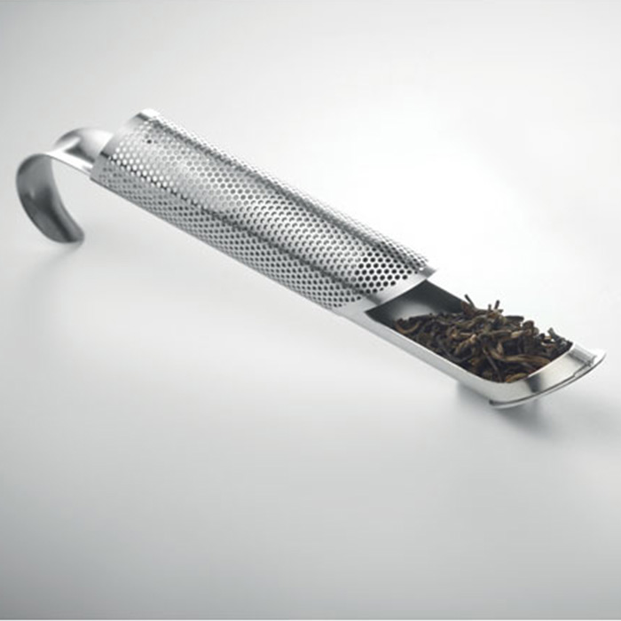 Our reusable stainless steel pipe tea infuser set Cha comes packed in a cotton pouch. This refreshing corporate gift set includes a tea filter with a compact, curved hook to hang over the edge of your cup or mug, allowing you to make your favorite fresh tea easily. It also comes with a cleaning brush to keep it pristine for your next cup of tea. Ideal for tea enthusiasts looking for convenience and quality in every brew. Branding options include printed logo on the pouch or laser engraved logo on the infuser.