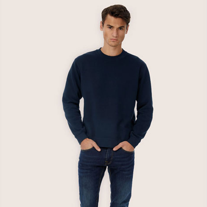 280 g/m². 80% Cotton, ring-spun and combed, 20% polyester. Set-in sleeves. Ribbed collar and hem with elastane. Fashionable close-fitting cut. Side seams.