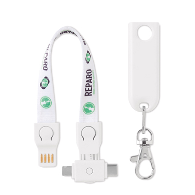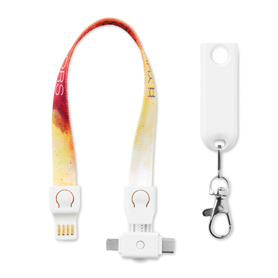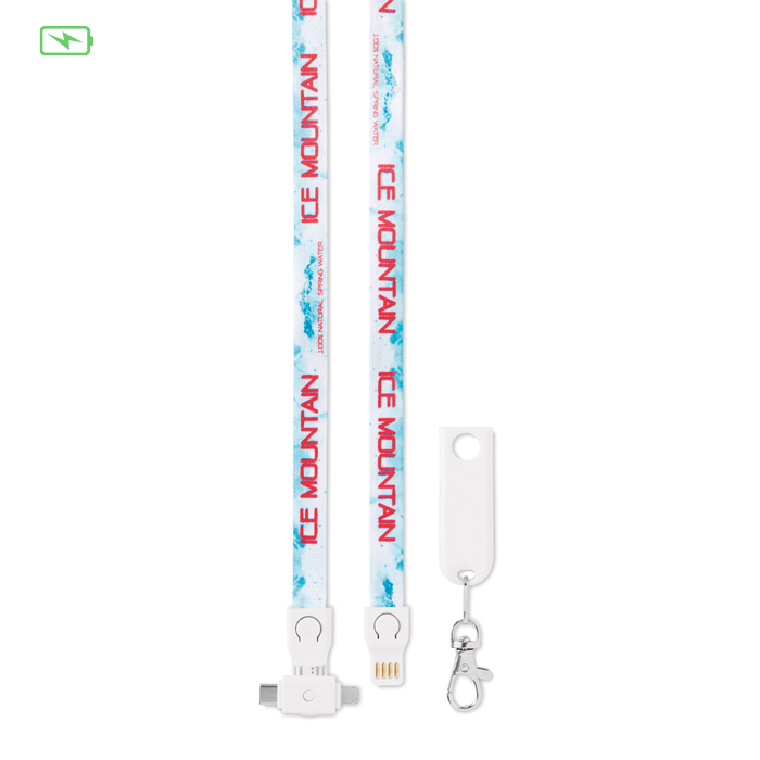 3-in-1 charging cable lanyard compatible with android and iPhones. Also consists Type-C connectivity. Only for charging, not for data-transfer. A full colour sublimation design on both sides is recommended.