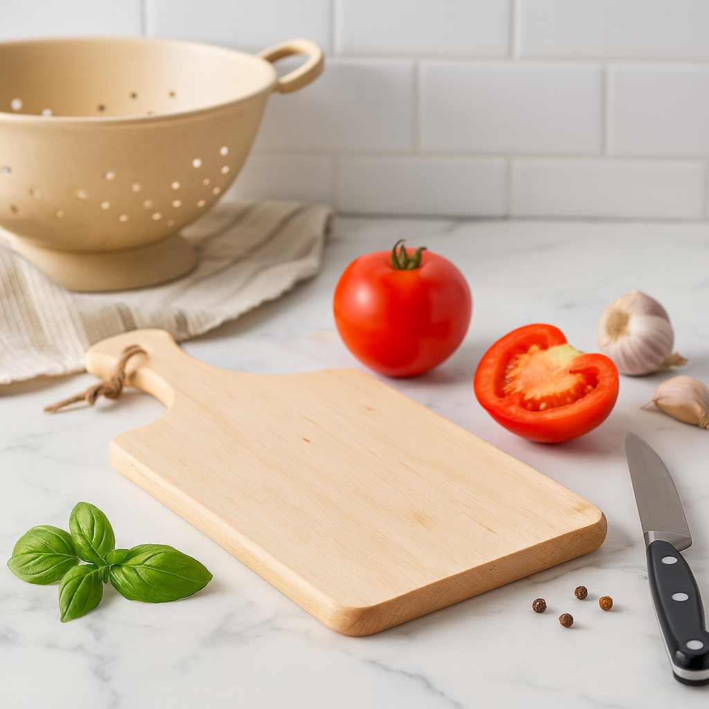 Cutting board with handle and cord hanger, manufactured in EU Alder wood.