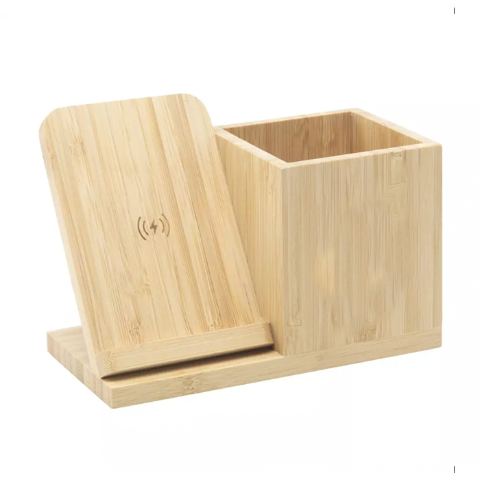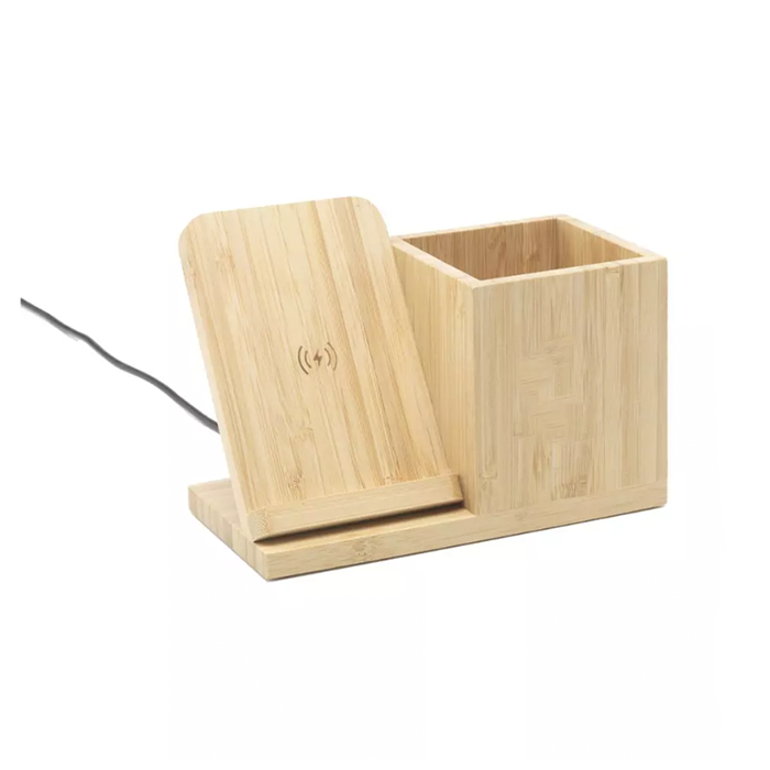 An ideal office desk organiser in eco-friendly bamboo material with an integrated 10w wireless charger. Stores writing instruments and small items and keeps your desk clear and organized. Compatible with all Android and iPhone smart phones. Each item is supplied in an individual brown cardboard box.