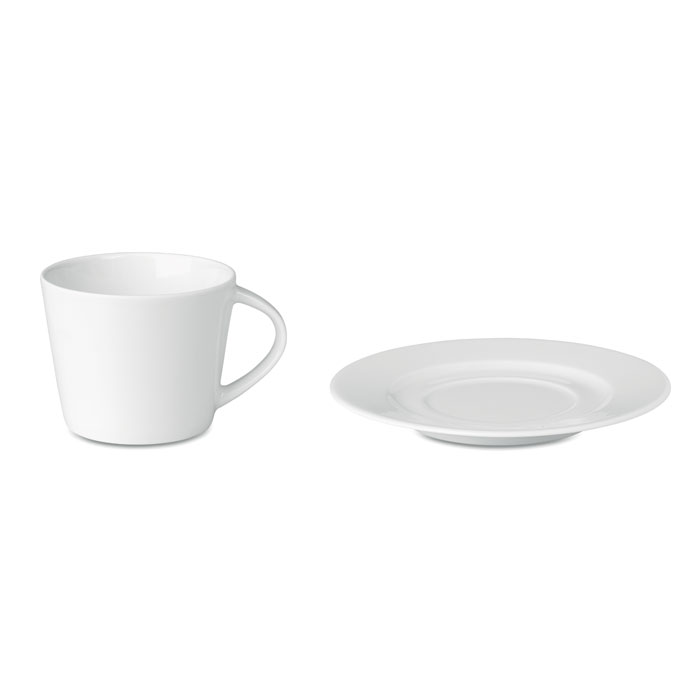 Porcelain conic cappuccino cup with saucer. Cup capacity: 180 ml. Bulk packaging. Pad printing is not dishwasher safe. Ceramic transfer is dishwasher safe.