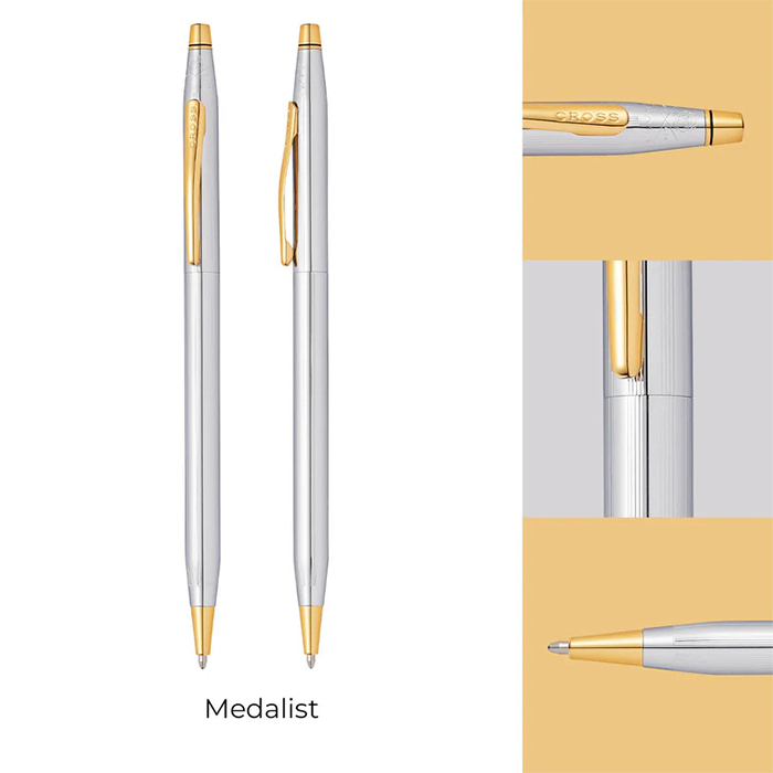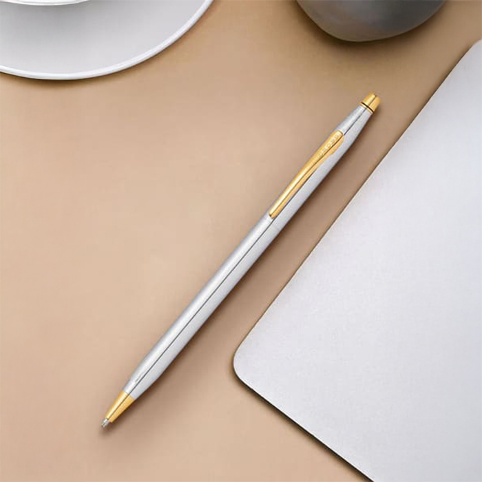 Classic century gold plated pen by Cross epitomizes timeless elegance with its slim, iconic design that has been celebrated for over 70 years. Distinguished by its classic style and premium craftsmanship, it features precious metal accents and comes presented in a luxurious gift box, making it ideal for life’s most significant moments. As the official Presidential pen, it embodies sophistication and reliability. Includes black ink and a lifetime mechanical warranty, ensuring enduring excellence with every use.