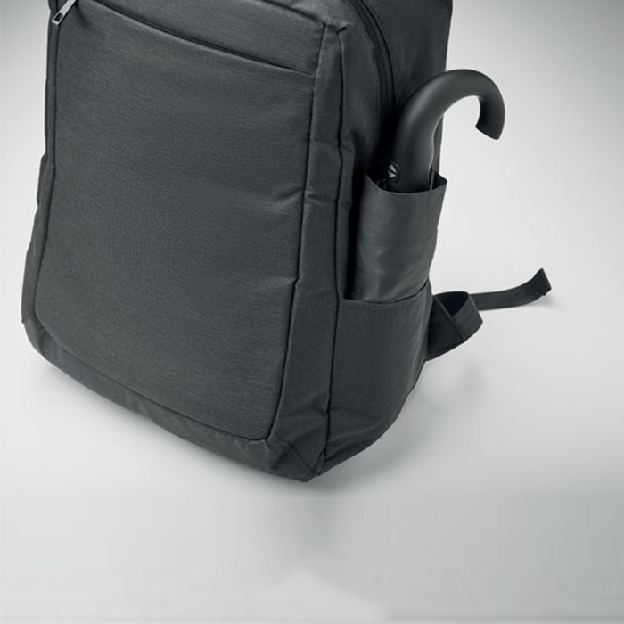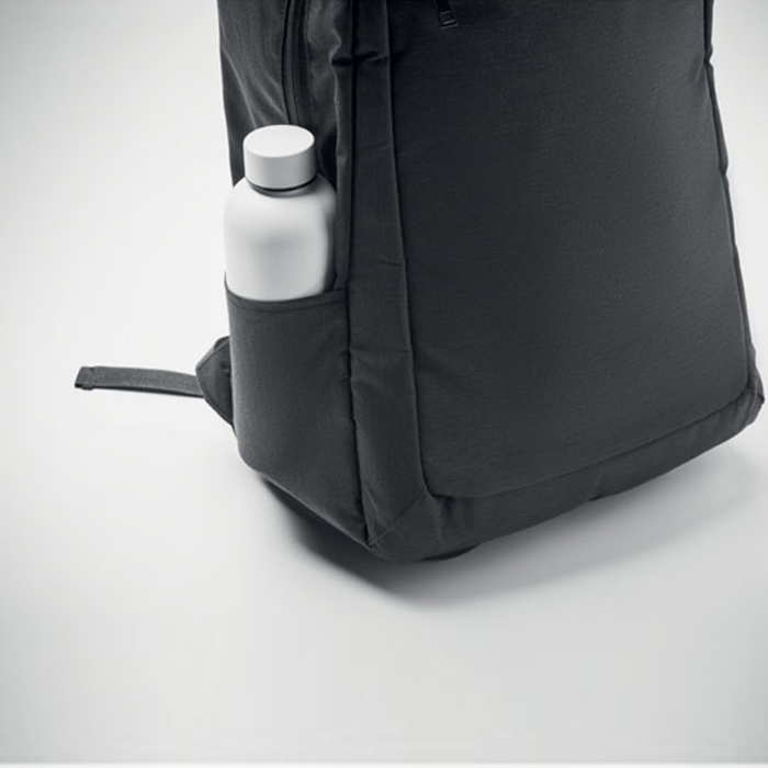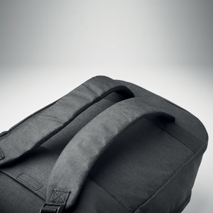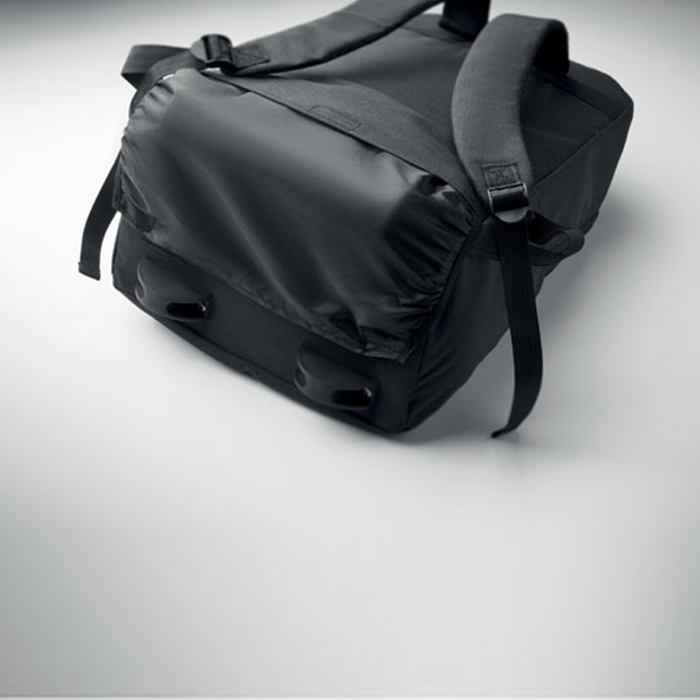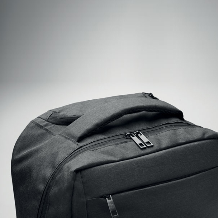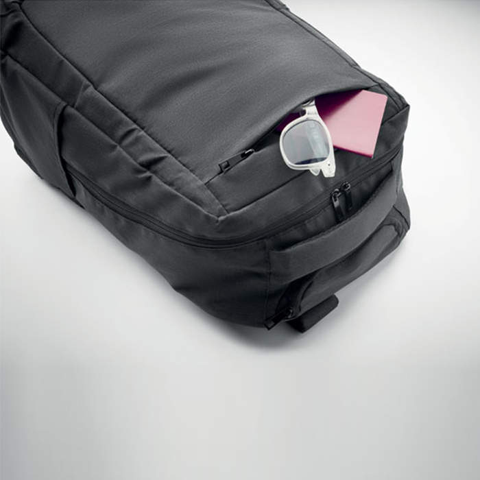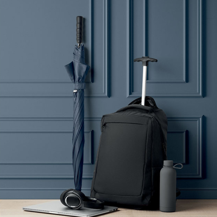 Versatile laptop backpack trolley combines style and functionality, crafted from durable 600D RPET polyester. It features a dedicated 15-inch laptop compartment, ensuring your device stays secure. With a zippered front pocket and two side slip pockets for easy access to essentials, it also includes three inner slip pockets for organization. Comfort is key, with padded back and shoulder straps, while the two wheels and double tube frame make transport effortless, perfect for both work and travel.