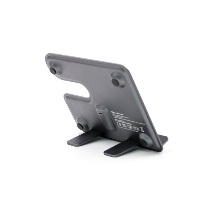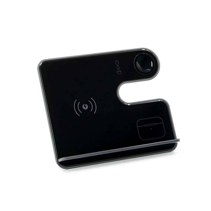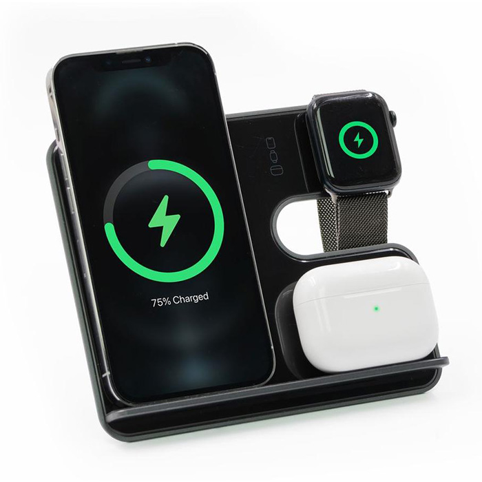 Power up sustainably with this sleek 3-in-1 wireless charging station designed for your phone, earbuds, and Apple Watch. Made from recycled aluminium, its removable L-stand offers versatility and easy transport. Whether upright on your desk or packed flat in your bag, it keeps your devices charged and organized in style. Compact, portable, and eco-conscious, the perfect companion for life on the go. Charge smart, live sustainably.