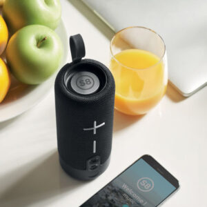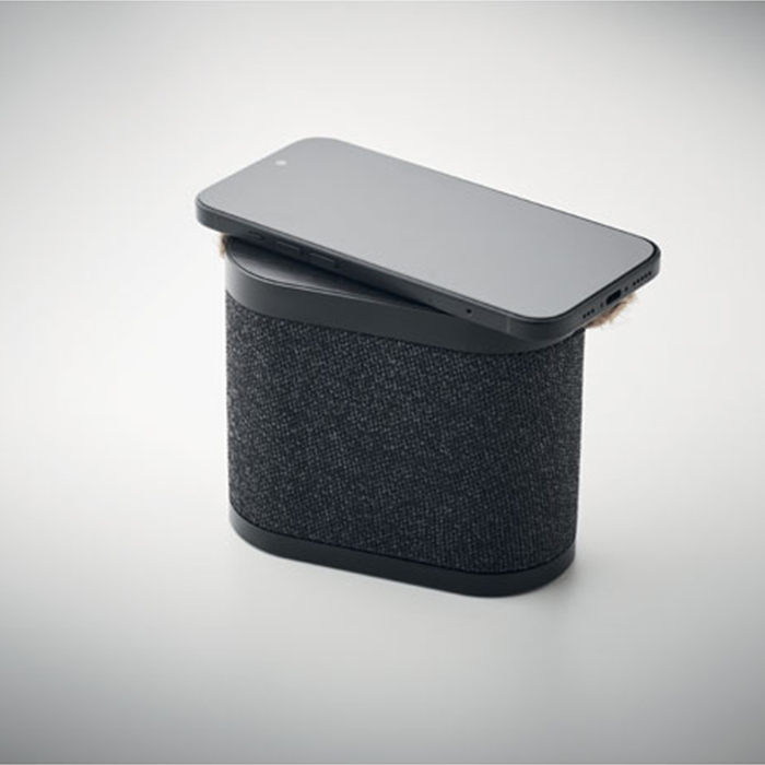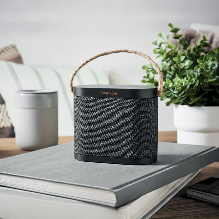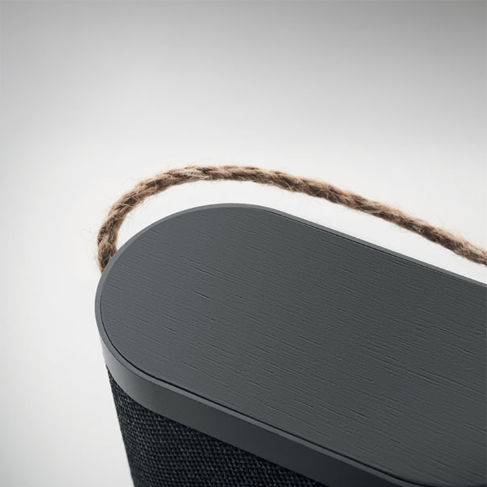 Elevate your audio experience with this eco-friendly 5.3 wireless speaker. Designed with ABS, RPET polyester fabric, and a bamboo wireless charger top, it combines style and sustainability. Enjoy 5W output, 4 Ohm resistance, and 5V power for clear, vibrant sound. Equipped with a 1200mAh Li-Ion battery, it offers up to 4 hours of playtime. The jute handle adds portability to its sleek design. Perfect for music lovers who value both quality and eco-conscious craftsmanship.