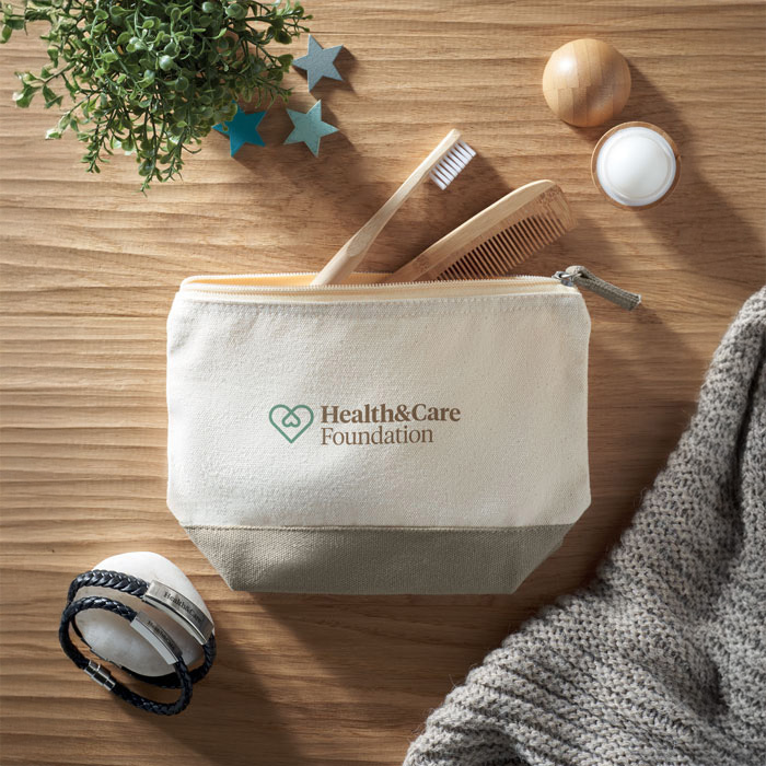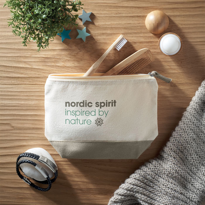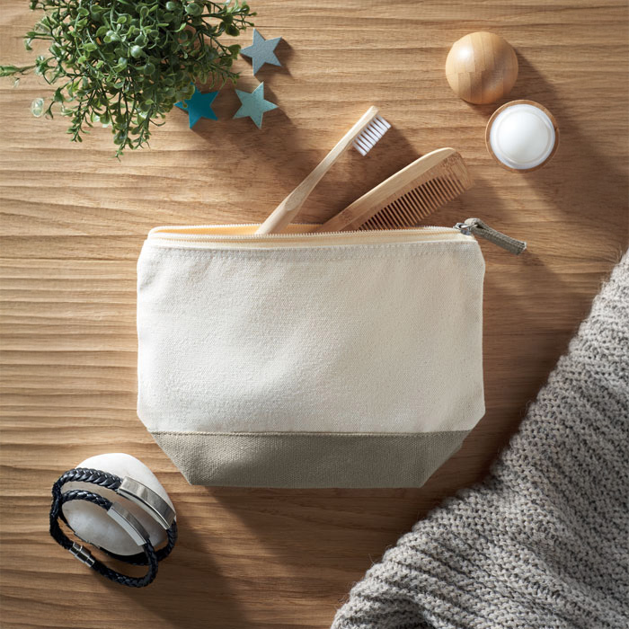 Cosmetic bag in cotton with coloured bottom and matching zipper puller. 340 gr/m².