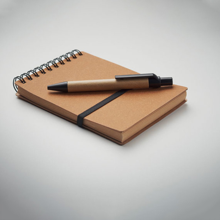 Stay organized sustainably with this eco-friendly notebook and pen set. The notebook features a recycled paper and PU cover (70% recycled paper, 30% PU), twin-wire binding, and 140 lined pages (70 sheets) made from recycled paper. An elastic closure strap and pen holder keep everything secure. The matching push-button ball pen, crafted from recycled carton and ABS parts, writes smoothly in blue ink. A perfect blend of style and sustainability for your everyday needs.