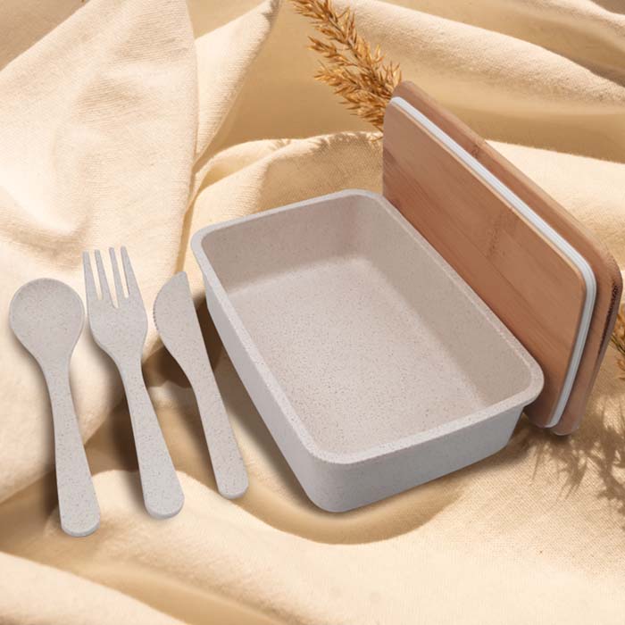 Pack your meals sustainably with our eco-friendly lunch box, crafted from recycled wheat straw and durable PP, topped with a natural bamboo cover. This single-layer lunch box is perfect for on-the-go, offering a compact design with a secure brown elastic band closure. Inside, you’ll find a complete cutlery set—spoon, fork, and knife—conveniently included for your dining needs. Embrace a greener lifestyle while enjoying the practical, stylish, and sustainable design of this reusable lunch box.