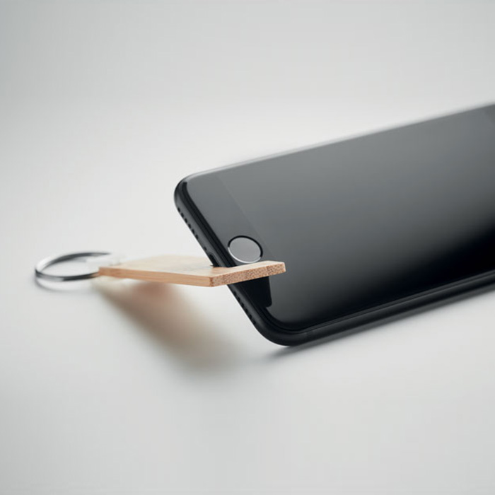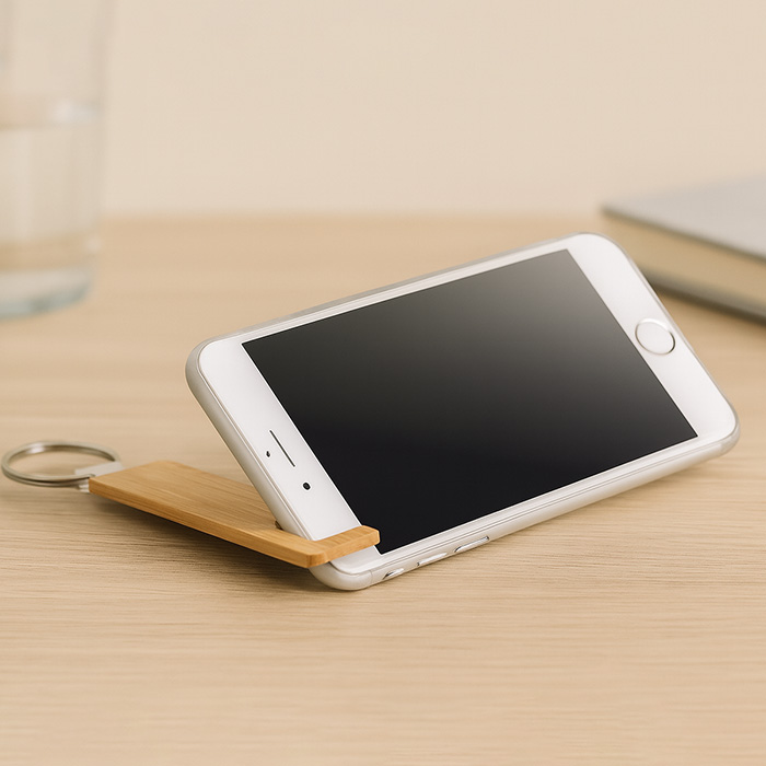 A versatile bamboo keyring that stylishly combines functionality with eco-friendliness. This compact accessory not only keeps your keys organized but also doubles as a convenient phone stand, allowing you to prop up your phone anytime, anywhere. Crafted from natural bamboo, each keyring is unique, showcasing slight variations in colour and size that add to its charm and character. The inherent qualities of bamboo make this keyring durable and lightweight, perfect for everyday use. Its dual functionality ensures you always have a handy phone stand at your fingertips, making it a practical and stylish addition to your daily essentials.