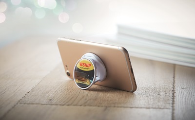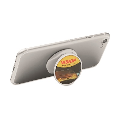 Two function, foldable ABS phone stand and holder with full colour printing or doming included. Size: 40x40mm. Each item is packed in an individual polybag.