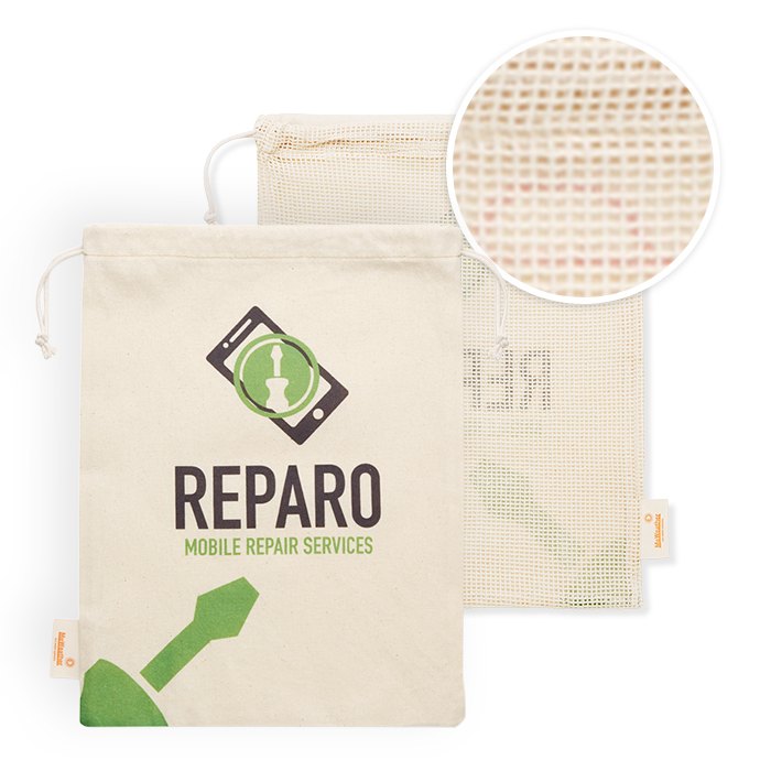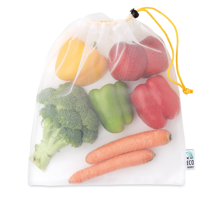 Cotton grocery bag with mesh on 1 side (30x20cm). Food Contact certified. Ideal for hoteliers and outdoor trips. Choice of Mesh and RPET materials