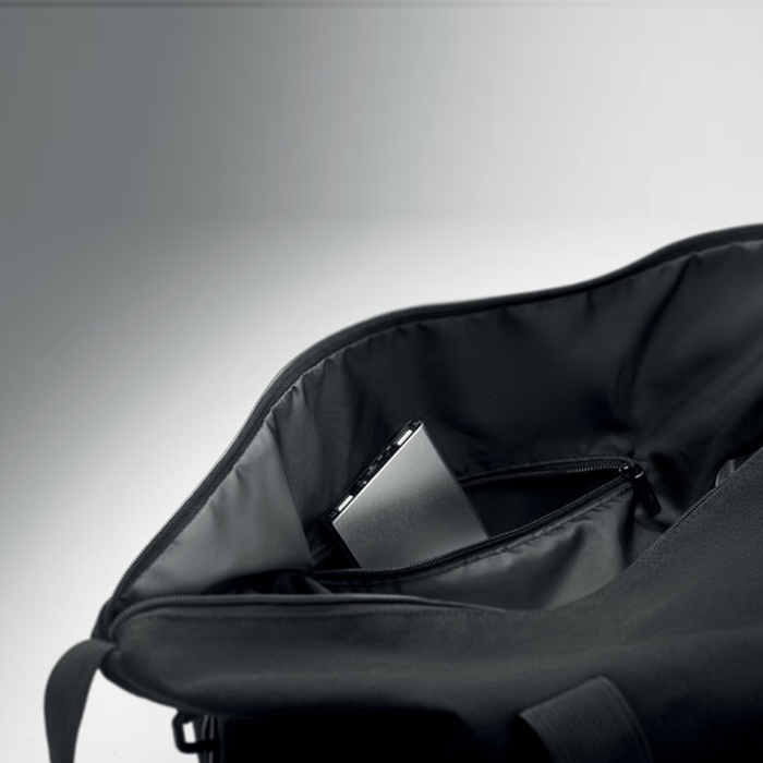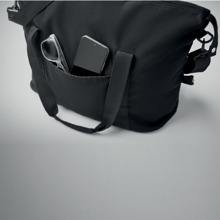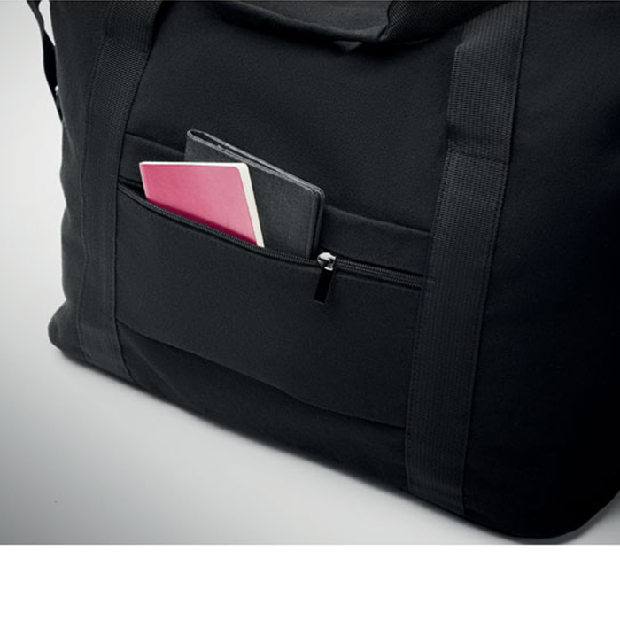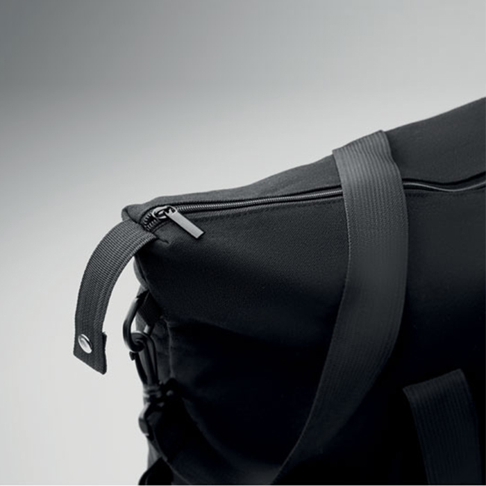 Eco-friendly weekend bag combines style and sustainability. Crafted from 70% recycled pre-consumer cotton and 30% recycled polyester, it features a durable 210D RPET polyester lining. The bag includes a front slip pocket, zippered back pocket, and a padded bottom for extra protection. With a removable, adjustable shoulder strap and a convenient trolley holder on the reverse side, it’s perfect for effortless travel, ensuring you stay organized and stylish on the go.
