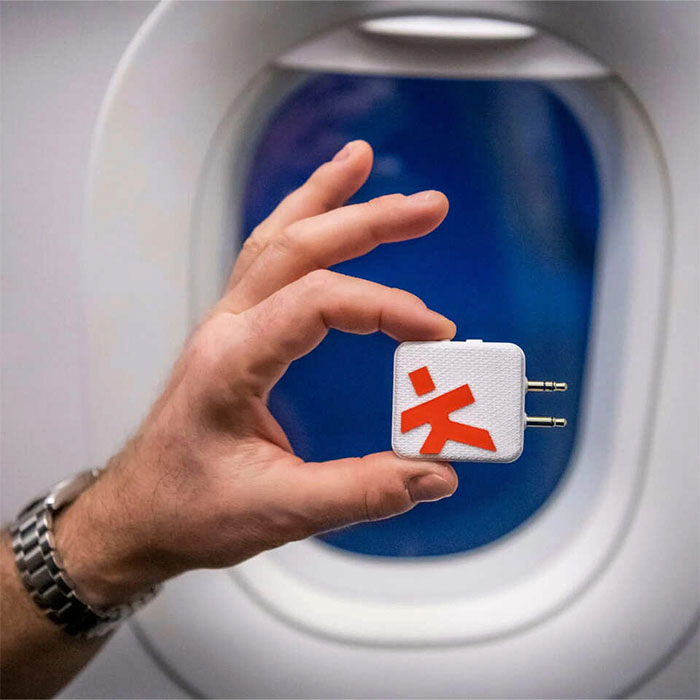 WU-TECH-3225 Wireless Audio Adapter connects wireless headphones or earphones to inflight entertainment systems, TVs, computers, cars, portable gaming devices, gym machines, and more, offering up to 20 hours of battery life with USB-C charging.