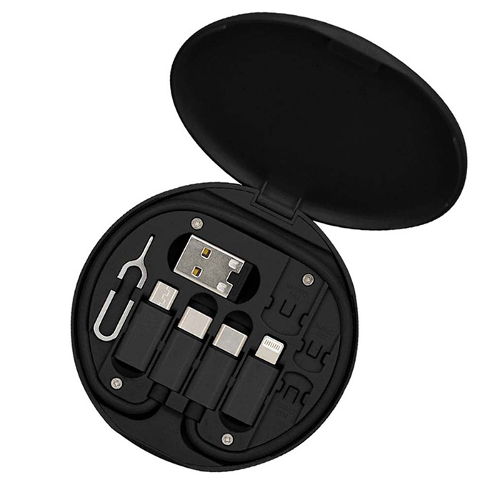 WU-TECH-3092 – Recycled Multicable versatile set including Type C, Lightning, micro-USB, and USB cables, along with an ejector pin and slots for micro-SIM, nano SIM, and TF SIM cards, all crafted from recycled materials.