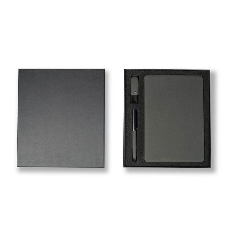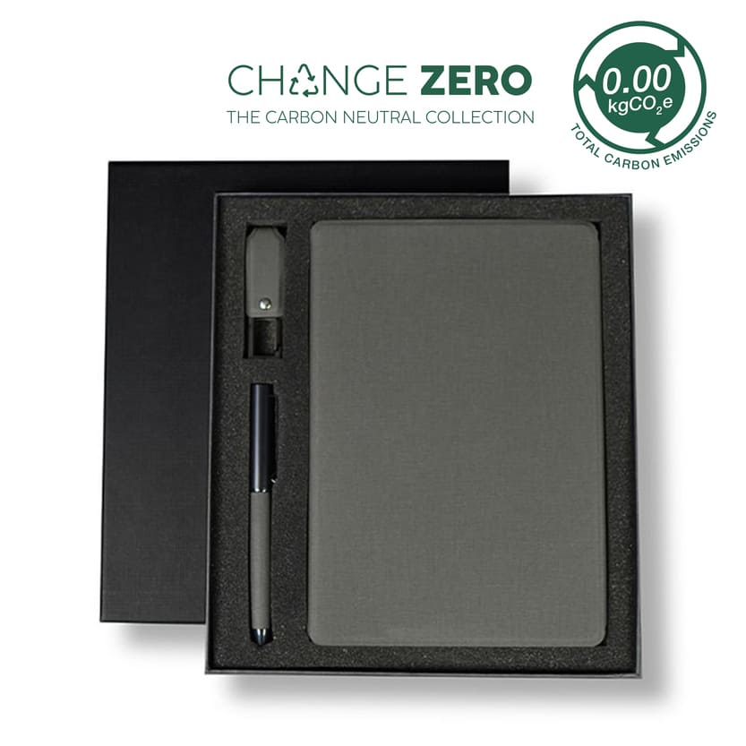 Sustainable gift set offers an eco-conscious, elegant solution for your stationery needs. It features a refillable A5 hardcover notebook, ball pen, and 32GB USB keychain, all made from GRS-certified recycled PU. Designed with a net zero carbon footprint, it reduces 37% of carbon emissions through recycled materials and offsets the remaining 1.23 kg CO2 eq via renewable energy projects. Presented in an elegant gift box, it’s a sophisticated, sustainable choice for everyday use.