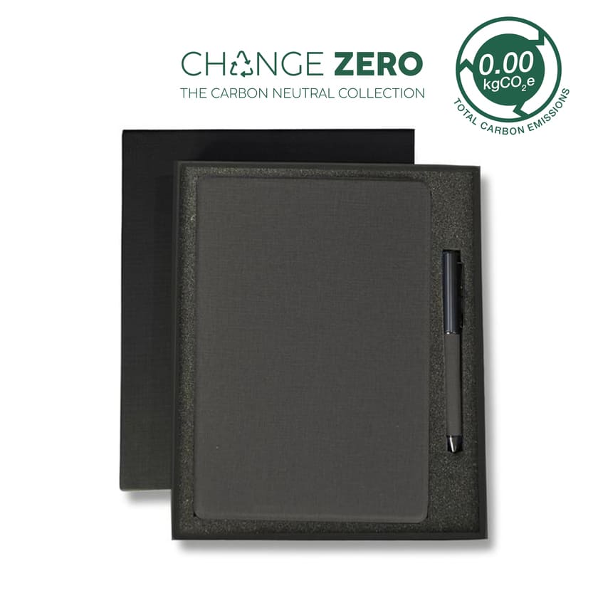 Sustainable Gift Set features a GRS-certified recycled PU refillable A5 ruled hardcover notebook and a matching recycled PU ball pen. Designed with elegance and sustainability, this set boasts a net zero carbon footprint. By using recycled materials, it reduces carbon emissions by 36% and offsets the remaining 1.25 kgCO2eq per unit through renewable energy projects, ensuring a carbon-neutral product. Presented in a sophisticated gift box, it’s the perfect eco-conscious choice for stylish and responsible gifting.