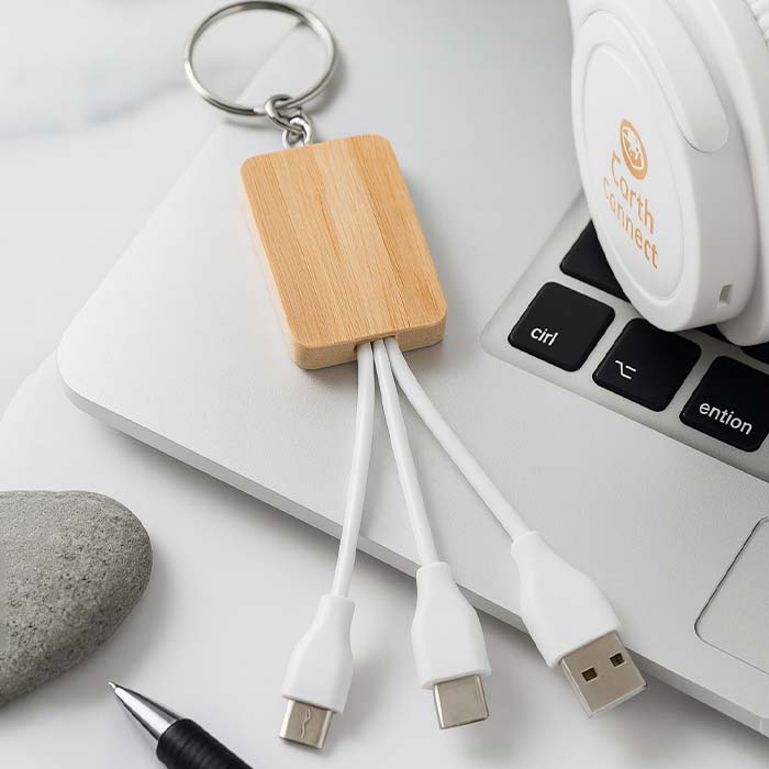 Bamboo cover key ring with charging cable with USB-A to Micro-B (2 in 1 pin) and Type C. As bamboo is a natural material, the colour per item can vary.
