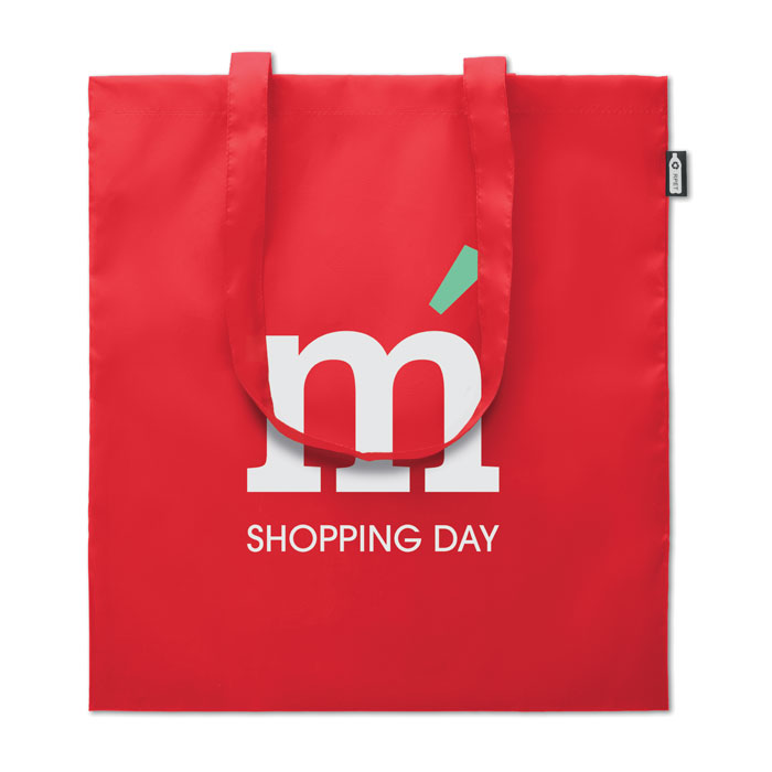 Shopping bag in 190T RPET with long handles. 100 gr/m². Eco-friendly material made from recycled plastic bottles.
