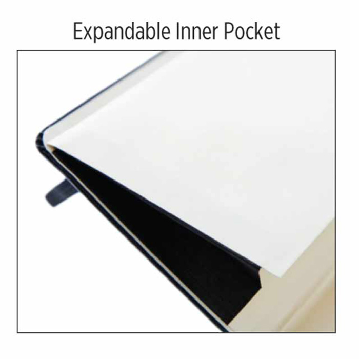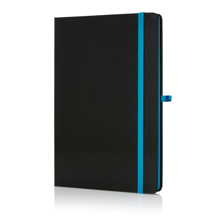 A5 size notebooks with hard PVC cover, pen loop, elastic closure and matching bookmark ribbon. 192 pages in 70 gsm. Expandable inner pocket. Packed in indivual paper sleeves
