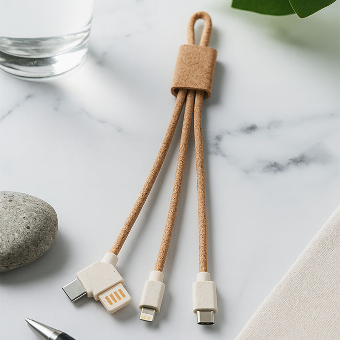 3-in-1 charging cable in sustainable cork material with type-C to type-C connection and a reversible iPhone and Android connection. Cork is 100% natural material. Due to its structural nature and surface porosity, the final print result per item may have deviations. Compatible with both Android and iPhone.