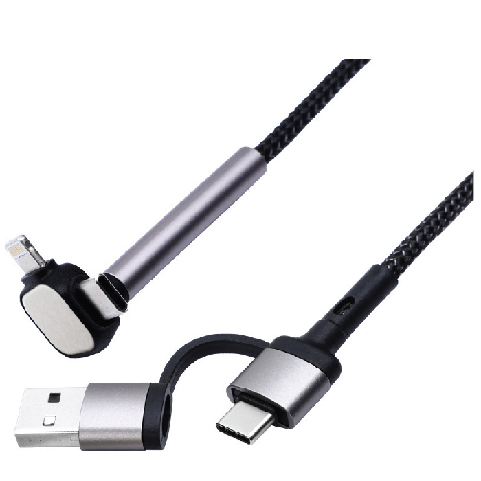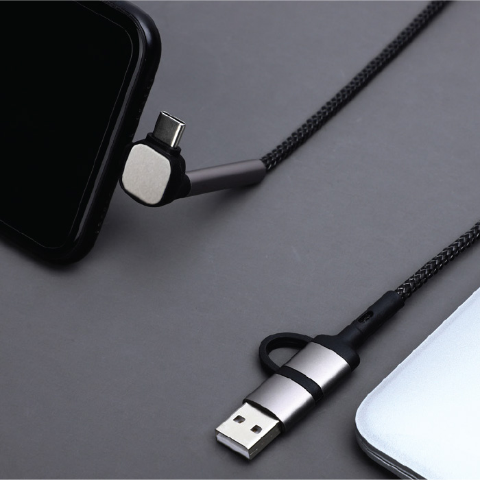 il is your all-in-one solution for quick and efficient charging. Crafted with precision in an aluminum alloy housing, this 1-meter braided cable supports Power Delivery (PD) for fast charging and data transfer. Its dual-input feature accommodates Type C and USB, while its dual-output supports Lightning and Type C connectors. It also moonlights as a convenient phone stand, making it a perfect addition to your workspace.
