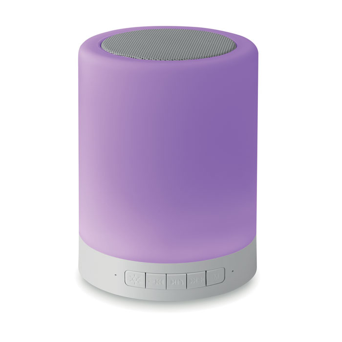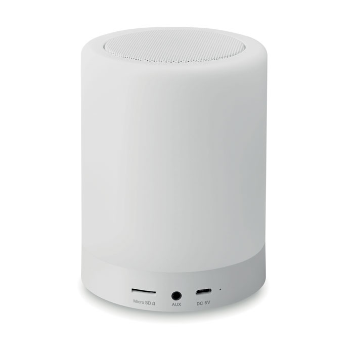 Table or camping wireless speaker with hands free function, SD card slot and regulating colour and brightness touch. 6 colours changing light. Rechargeable Li-Ion 2000 mAh. Output data: 3W. Playing time aprox. 2h.