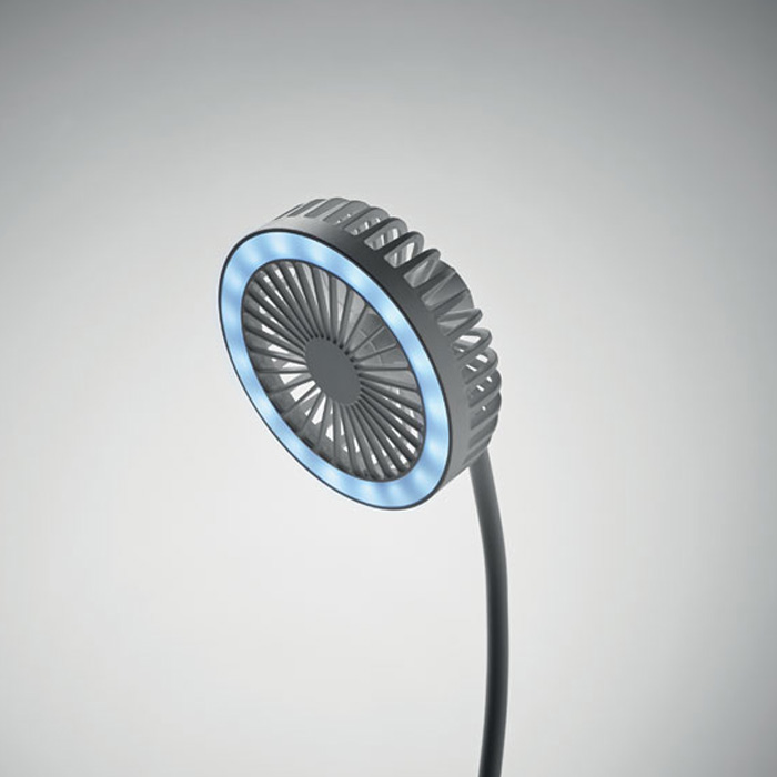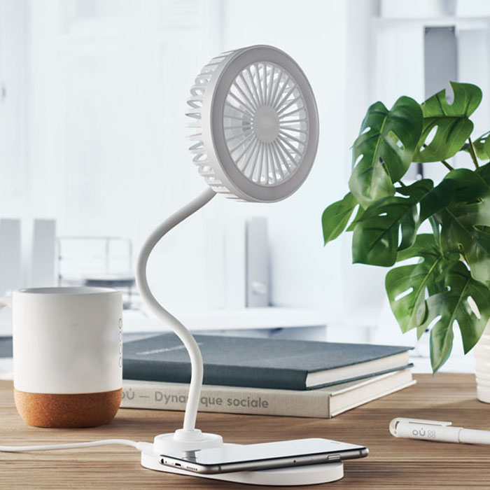 An ABS desktop fan with 3-speed settings, a 10w quick wireless charger, and LED lights functionality (80 lumens). Output: DC 9V/1.1A (10W) for fast charging. Compatible with the latest Androids, iPhone® 8 and newer.