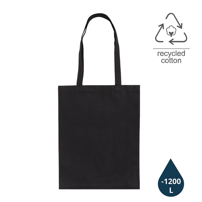 Recycled Cotton Shopping Tote Bag, Certified by Global Recycled Standard (GRS). Made with 140 GSM recycled cotton – a light and durable fabric. This bag has saved 1,200 liters of water by substituting water-thirsty cotton fabric with recycled cotton. Size 42 x 36 cm