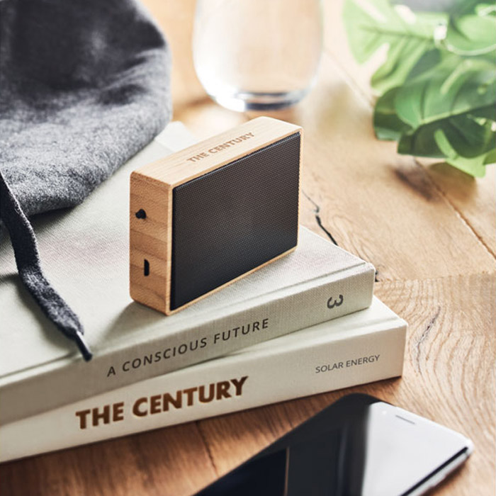 5.0 wireless 3W sustainable solar-powered speaker with bamboo casing. 1 Rechargeable Li-Ion 500 mAh battery. Playing time approx. 4h.