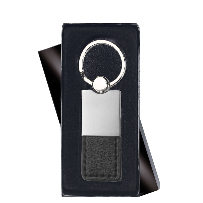 Metal and PU leather key ring. Black gift box.
