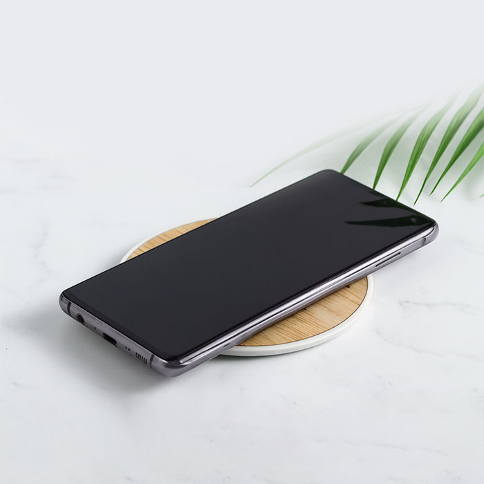 Step up your wireless charging experience with Lanka, a sustainable 15W bamboo fast charging pad – a synergy of innovation and eco-friendliness. Made with certified recycled plastic and bamboo, this gadget ensures rapid wireless charging for Qi-standard-enabled smartphones, while its elegant bamboo surface adds sophistication to any space. Compact and lightweight, it’s a portable companion. An ideal desktop item with a wide area to showcase your brand’s commitment to sustainability. Packaging includes a kraft carton box with the pad, user manual, and Type-C charging cable. Compatible with both iPhones and Android devices.