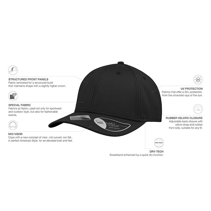 Elevate your outdoor experience with our six-panel cap, designed with a UPF50+ exterior for optimal sun protection. Featuring the innovative DRY-TECH sweatband for quick-drying comfort, this cap is perfect for sports and outdoor adventures. Crafted from a blend of 75% nylon, 20% cotton, and 5% elastane, it offers a comfortable fit that moves with you. The new rubber hook-and-loop closure ensures a secure fit, making it an essential accessory for any active lifestyle. By Atlantis, Designed in Italy.
