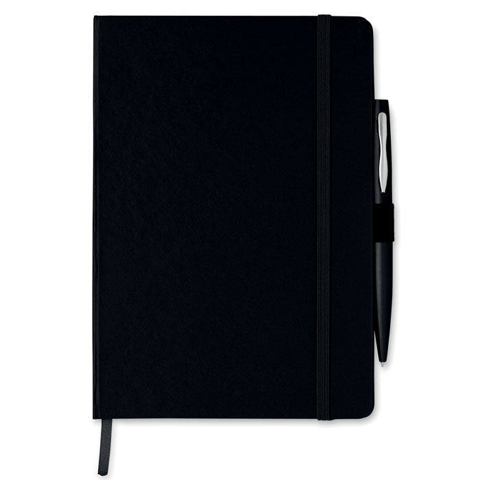 A5 notebook with pen. Hard PU cover. Casebound. 144 lined pages (72 sheets). Matching elastic closure strap, ribbon bookmark and pen holder. Matching metal push button ball pen. Blue ink.