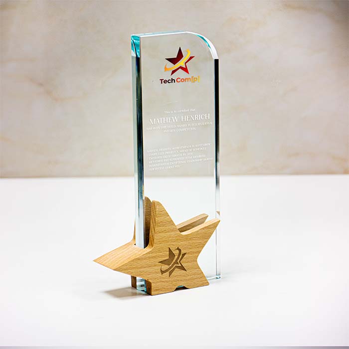 Enhance your recognition efforts with our stunning crystal award, elegantly perched atop a beautifully handcrafted wooden star base. This exquisite combination of fine crystal and artisanal woodwork ensures a distinguished presentation that embodies both elegance and craftsmanship. Perfect for honouring excellence or achievement, our award blends timeless design with superior materials, creating a striking centrepiece that symbolizes accomplishment and prestige. Whether celebrating milestones in business, sports, or academia, our crystal award on a wooden star base stands as a testament to exceptional performance and serves as a cherished memento of success.