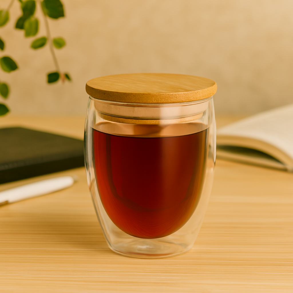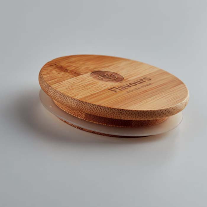 Double wall high borosilicate glass with bamboo lid with silicone ring. Capacity 350 ml. Bamboo is a natural product, there may be slight variations in colour and size per item, which can affect the final decoration outcome.