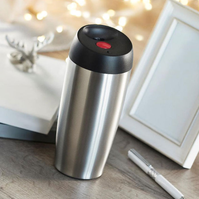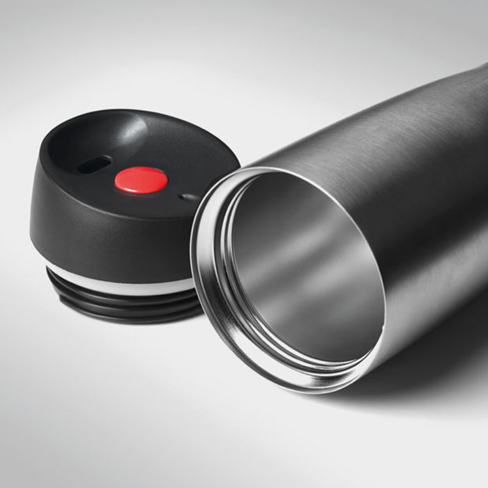 This travel cup is crafted with double-walled stainless steel for superior insulation and durability. It features a secure polypropylene (PP) lid equipped with a push-button function for convenient opening and closing. The design ensures the cup is completely leak-proof, providing peace of mind when you’re on the go. With a capacity of 350 ml, it’s the perfect size for your favourite hot or cold beverages.