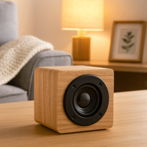 5.1 wireless speaker in bamboo casing, with cotton on top and a hanging loop. 1 Rechargeable Li-POL 300 mAh battery included. Includes an SD card port and an AUX/ USB cable. Output data: 3W, 3 Ohm and 5V. Playing time approx. 3 hours.