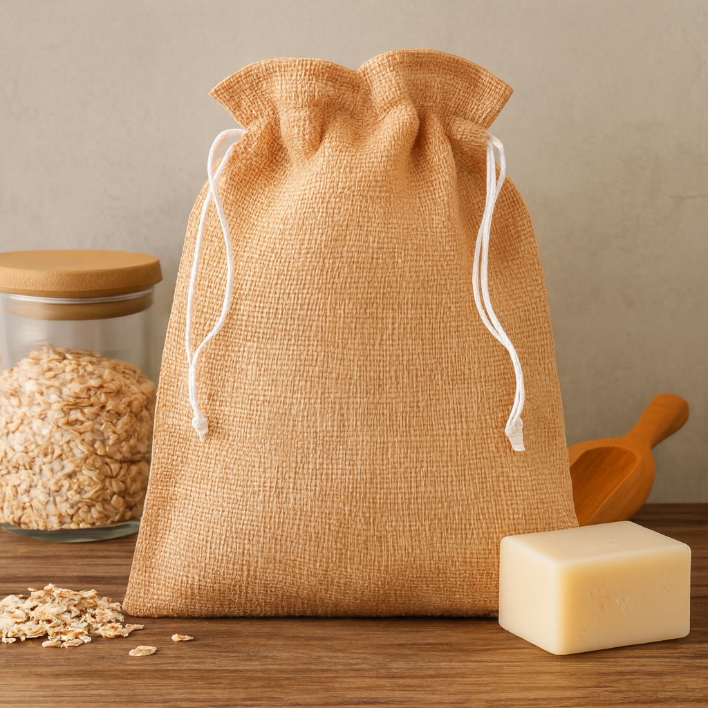 Medium gift jute draw cord bag. Size approx. 25 x 32cm.