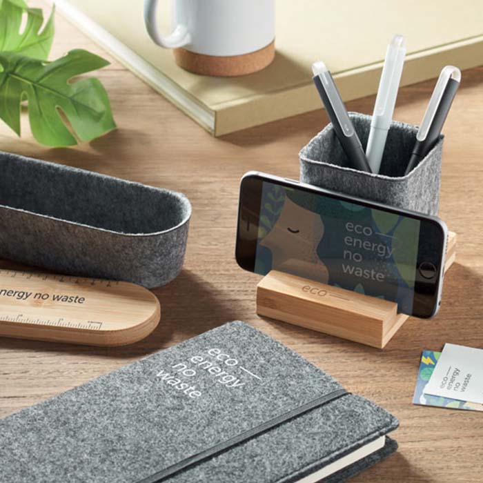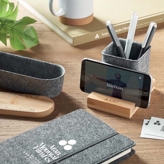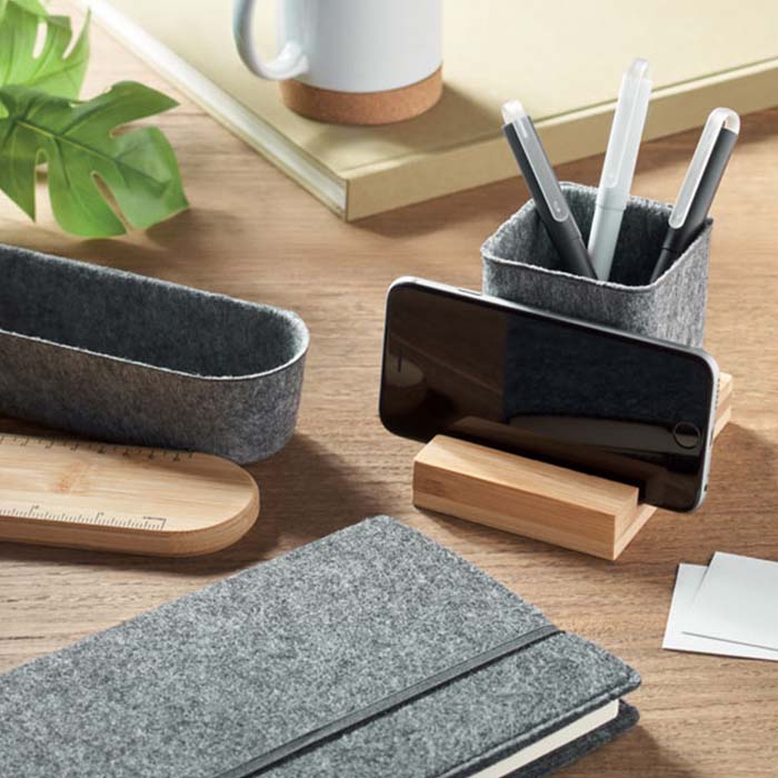 Eco-friendly felt pen holder made from recycled PET (RPET) materials, featuring a stylish bamboo base. This multifunctional desk accessory not only organizes your pens but also includes a convenient stand for your phone. The sustainable bamboo base adds a touch of natural elegance, making it a perfect addition to any workspace. Designed with both functionality and environmental consciousness in mind, this pen holder helps reduce plastic waste while keeping your desk tidy. Ideal for home or office use, it blends seamlessly with any decor, offering a practical and eco-friendly solution for your organizational needs.