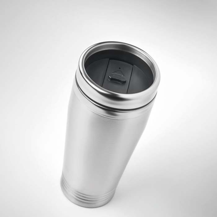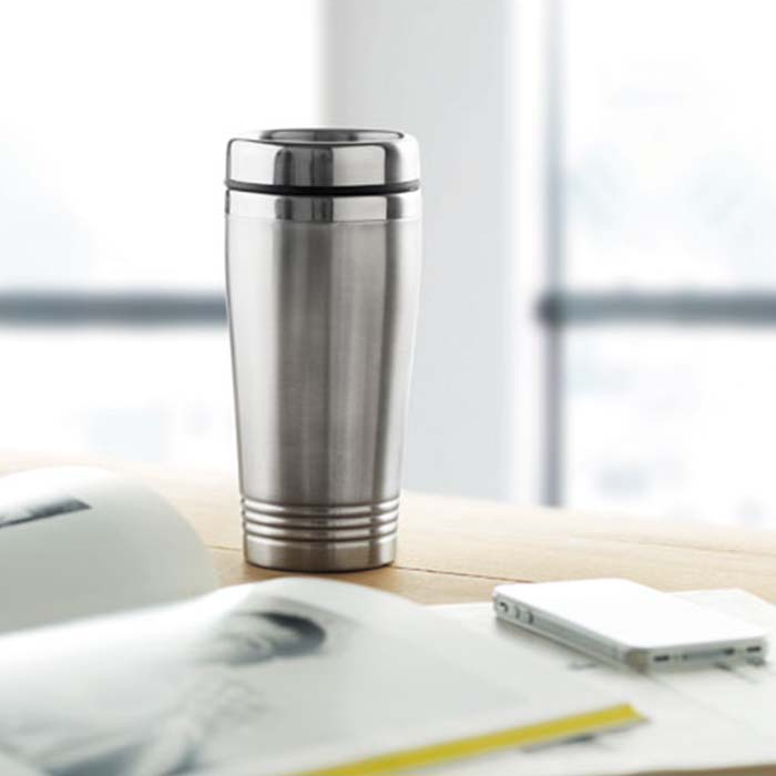Double wall stainless steel travel cup with black PP lid. Capacity: 400 ml.