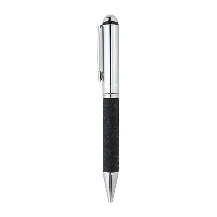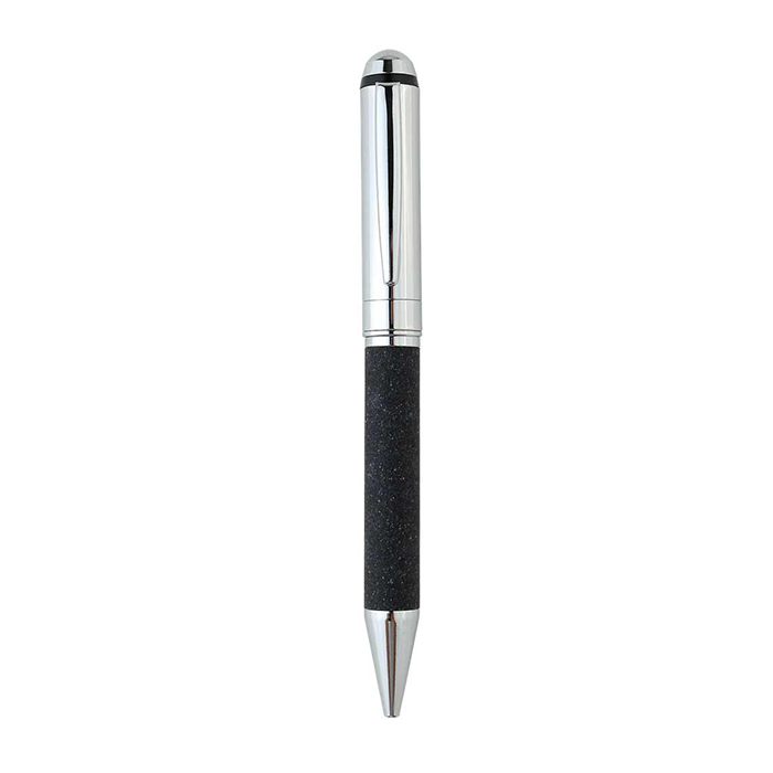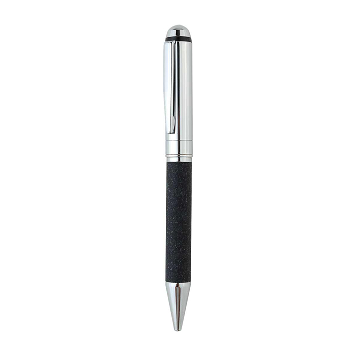 A chic and eco-friendly metal pen with a recycled leather barrel. Packaged in a vintage recycled leather tube gift box, this sleek twist mechanic ball pen offers an eco-conscious choice for companies. The chrome metal offers excellent space for engraved logo branding and personalization. Stand out of the crowd with this unique sustainable gift.